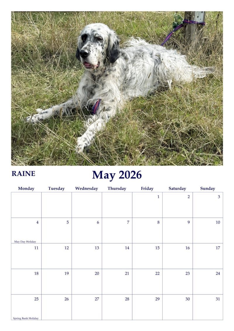 Every page features a beautifully captured photograph of an English Setter/s who have been rehomed through ESAW over the years. These are not just pictures, they are stories of the joy that comes from giving an English Setter the life they deserve. The calendar is a reminder of the reason for supporting ESAW.